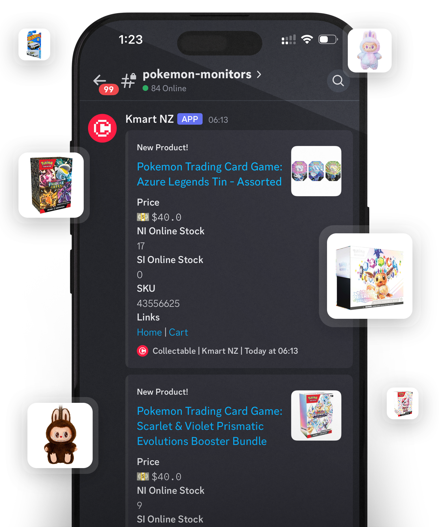 Covering alerts for over 150+ retailers across NZ. We’re here to deliver lightning-fast alerts, stock updates, & tools to help you get your Pokémon TCG, Popmart, & other collectibles for RRP.